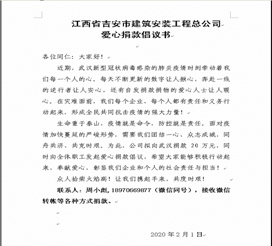 愛心捐獻,抗擊疫情。吉安建總作為一家有溫度、有使命感的國有企業,秉承著一貫的感恩文化,義不容辭踐行企業社會責任,向吉安市慈善總會捐款20萬元援助武漢,作為抗擊疫情愛心善款;與此同時,向公司全體干部員工發出募捐倡議,發動全公司力量開展個人捐款活動,短短2天時間,就有 96名黨員職工響應,累計捐款4.46萬元(含職工個人向社會慈善機構捐助款)。